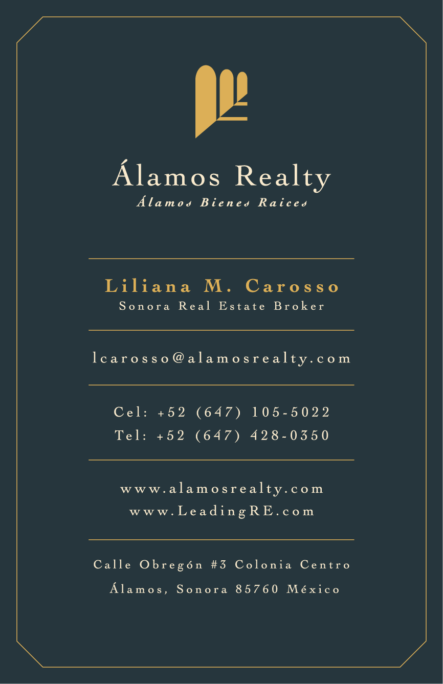 Liliana Margarita Carosso, Broker - Licensed in the State of Sonora - Entrepreneur, is bi-lingual, originally from Buenos Aires, Argentina. More recently, a transplant from Kalamazoo, Michigan, although, Liliana has lived in Northern Mexico since 1989. As an international business consultant, Liliana has years of experience operating a business in Mexico as a foreigner. She is enthusiastic about the quality of lifestyle Alamos has to offer and is willing to share what she knows to enhance your relocation experience.
